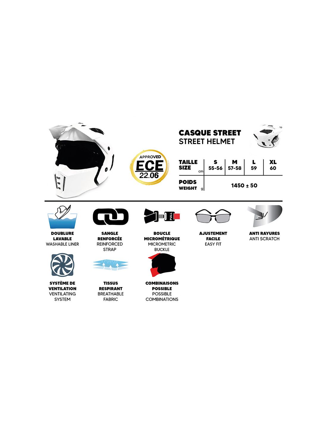 Casque Street Blanc Mentonnière démontable Vendu avec 1 visière Clair + 1 Noir Support Gopro Inclus Emplacement Prévu pour système de communication Bluetooth (Option) Conforme Norme ECE R22.06 Le casque Street FRV est un accessoire incontournable pour tous les amateurs de mobilité électrique. Conçu avec soin et attention aux détails, ce casque offre à la fois style et sécurité pour vos déplacements en ville.
